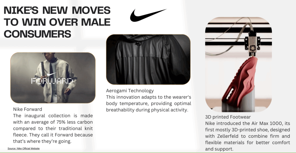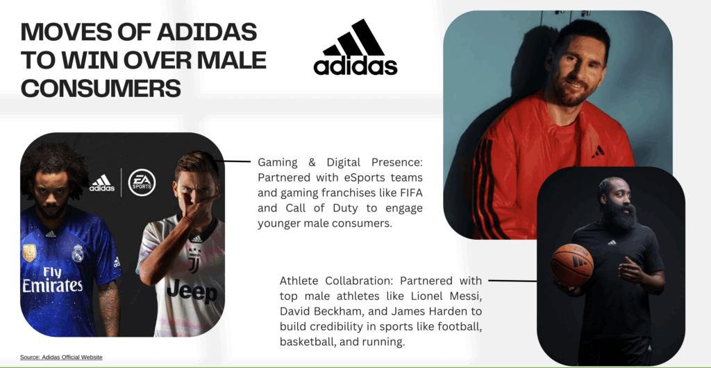 Competitors (Nike, Adidas) have tapped into this space using athlete partnerships, 3D innovation, and gamification to capture male interest.